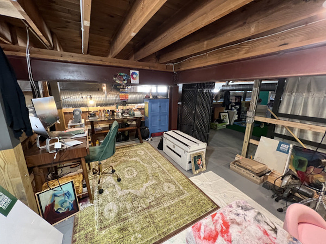 Nestled within a generous loft space spanning 240 square feet, this studio unveils a world of possibilities. Commanding a striking vantage point, it overlooks the air-conditioned and heated studio spaces below, offering a unique perspective on the bustling creative hub. Its charm lies in its understated elegance, featuring a rustic wooden floor, innovative pegboard half-walls, and a captivating exposed ceiling, creating an inviting atmosphere. Meticulously designed for your comfort, the studio is well-ventilated and includes the convenience of private fans for personalized climate control. Whether you're in search of an inspiring workspace or a serene haven, this studio effortlessly combines functionality with an industrial flair, igniting your creative journey in a space that adapts to your every need.