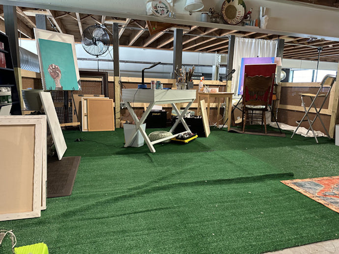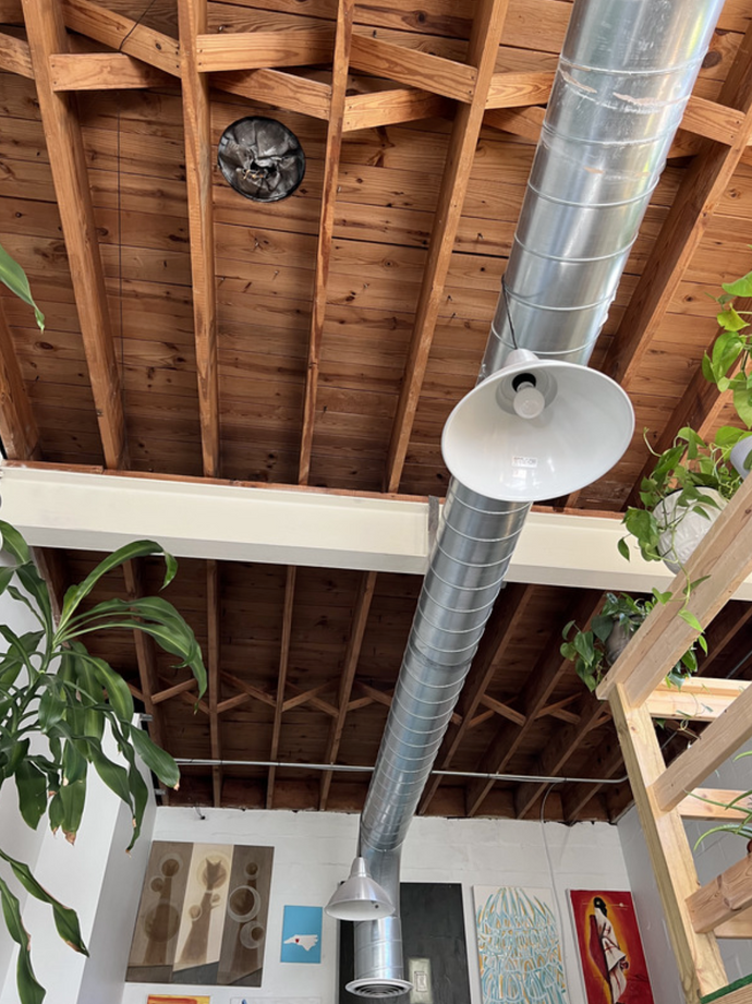 Nestled in half of a spacious loft encompassing 184 square feet, this studio offers an exceptional vantage point with panoramic views of the surrounding air-conditioned and heated studio spaces. Its simplicity is its charm, featuring a rustic wooden floor, peg board half-walls, and an exposed, though modest, ceiling space. The studio is thoughtfully designed for comfort, boasting excellent ventilation and equipped with private fans for personalized climate control. Whether you seek an inspiring workspace or a a storefront area, this studio combines functionality with a touch of industrial character, making it a dynamic haven for your creative pursuits.
