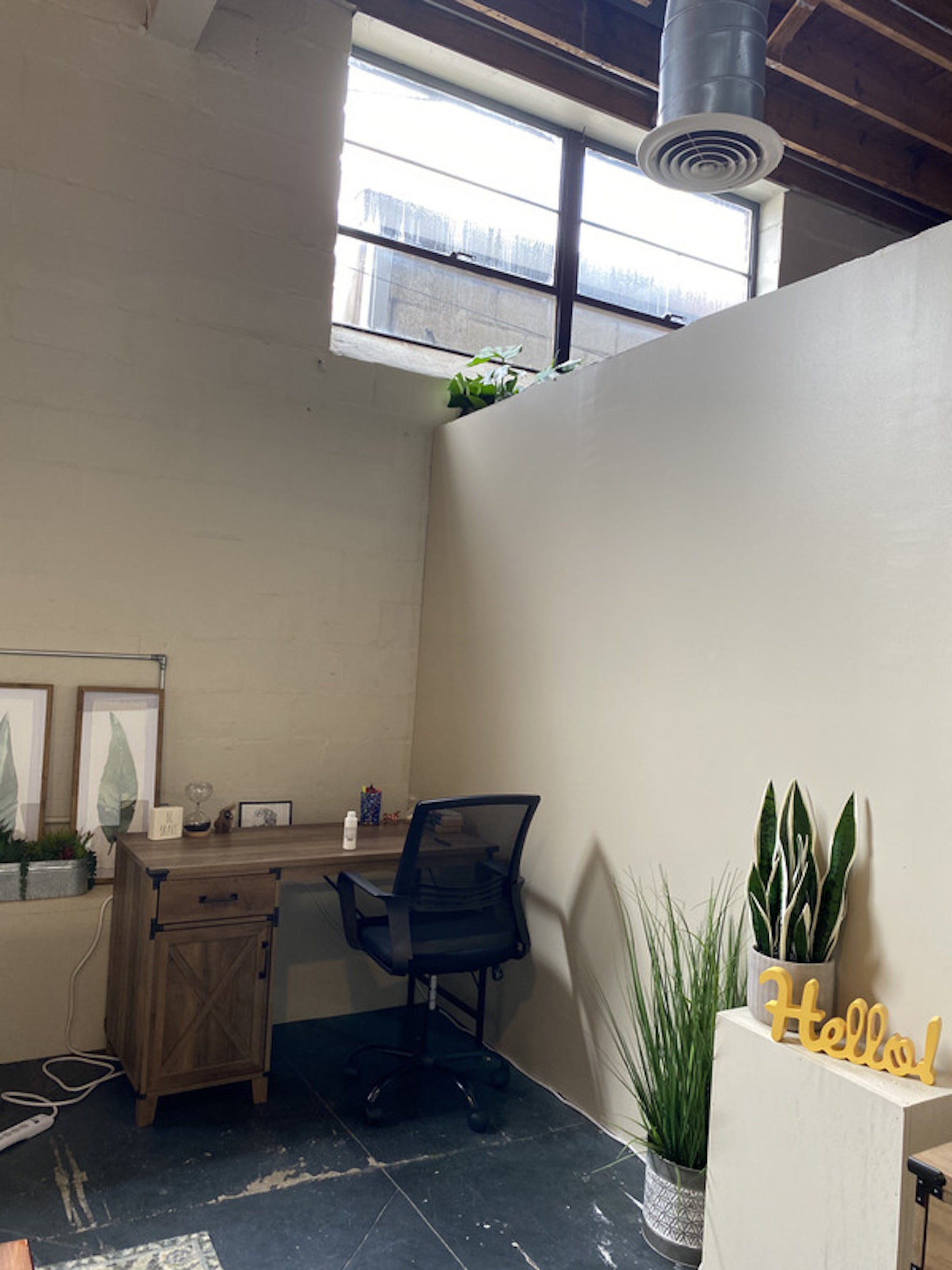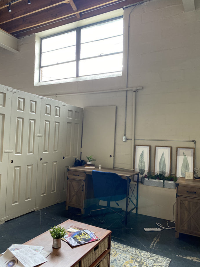 Nestled within the center of our shared co-working space, but with walled privacy, this large studio spans 192 square feet and exudes an air of sophistication and versatility. Boasting sleek and resilient concrete floors, it provides an elegant backdrop for your creative endeavors. The open, exposed ceilings lend an industrial chic aesthetic, merging the contemporary with the classic. Whether it's an inspiring workspace, an artistic haven, or a professional setting, this studio embodies both functionality and style, all within the heart of our workspace, where innovation thrives.